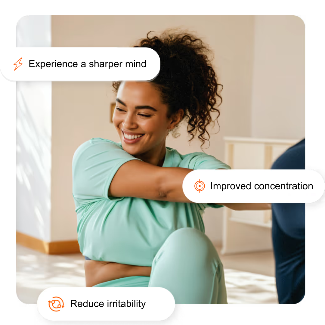 Hot flashes 70-90% reduced. Brain fog clearing. Mood stabilizing. You're starting to feel like yourself again.